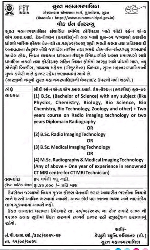 સુરત મહાનગરપાલિકા ની આ ભરતી સંબંધિત જાહેરાતમાં મળેલ વિગતો મુજબ સીટી સ્કેન એન્ડ એમ.આર.આઈ. ટેકનીશ્યન (કરારીય) ના પદો પર ભરતી ની પ્રક્રિયા ચાલી રહી છે. તેથી પદો ને લગતી વધુ માહિતી જાણવા માટે જાહેરાત જરૂર થી વાંચો.